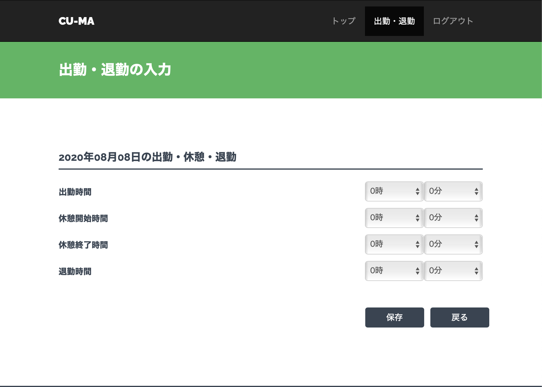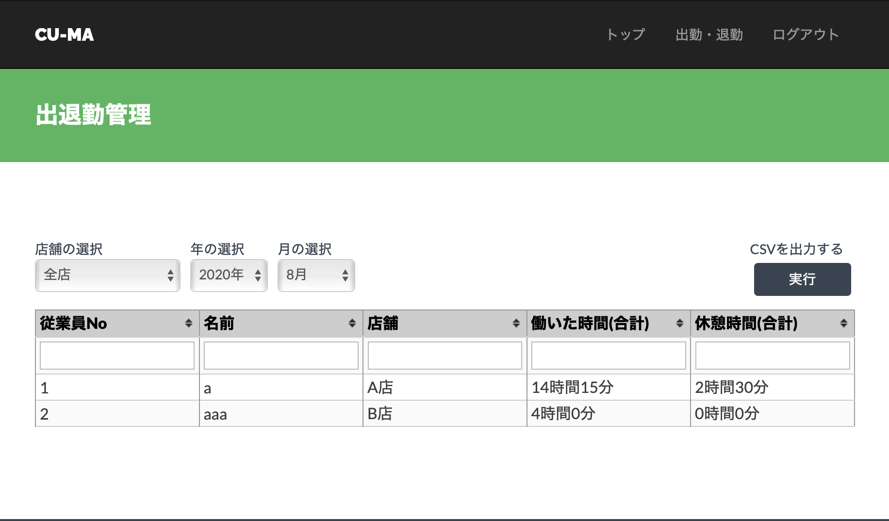 出退勤の一覧表示、1ヶ月分の勤怠時間の自動計算、1ヶ月分のデータのCSV出力ができます。