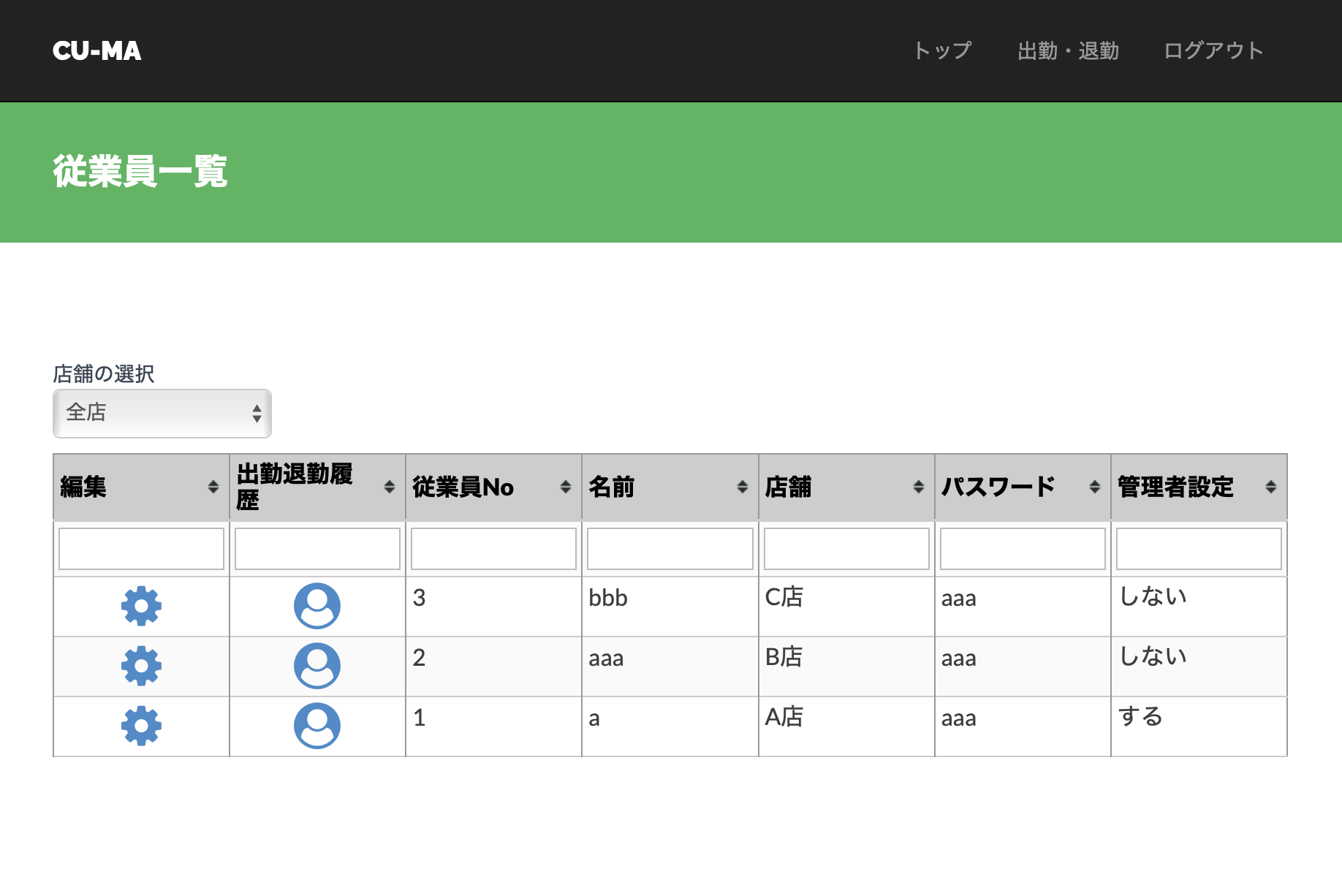 従業員の情報を編集、出退勤時間の編集ができます。出退勤の入力忘れはここでカバーできます。